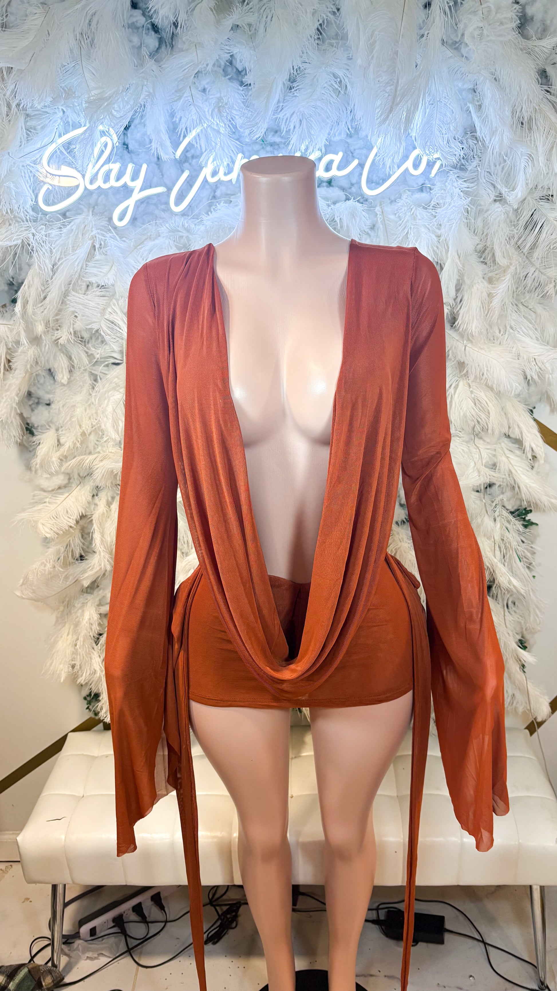 Her Main Attraction Draped Mesh Dress - Burnt Orange