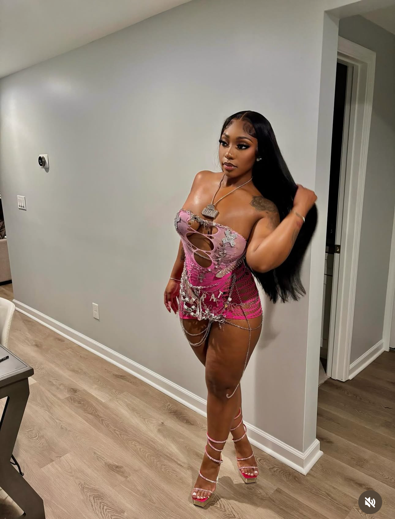 As of February 1 the necklace layering the top for the piece is out of stock and will be replaced with a similar one and the brat chain is out of stock and will be replaced with either the SEXY CHAIN OR THE BITCH CHAIN